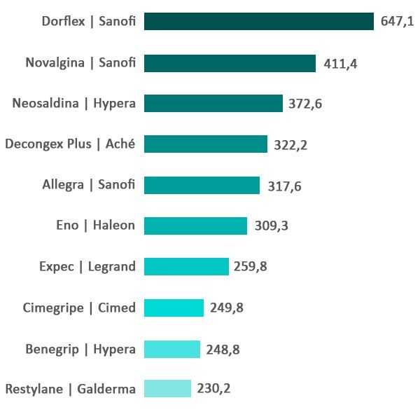 A Novalgina vem na segunda posição, com R$ 411,4 milhões e 28,3% de crescimento. Marca referência em dor e febre segundo a Anvisa, o analgésico completou 100 anos no Brasil em 2022. Em terceiro lugar, o descongestionante nasal Decongex Plus, do Aché, movimentou R$ 322,2 milhões nas prateleiras. Foi o segundo MIP com maior crescimento entre os top 10 – 105,7%. É seguido de perto pelo Allegra, antialérgico da Sanofi, com R$ 317,6 milhões. O sal de fruta Eno aparece na quinta colocação. A marca faz parte do portfólio da Haleon, farmacêutica 100% focada em consumer health e que iniciou operações em julho passado após cisão com a GSK.